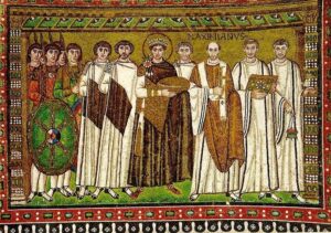 Το παραπάνω ψηφιδωτό είναι χαρακτηριστικό δείγμα μνημειώδους ζωγραφικής και προέρχεται από το ναό του Αγίου Βιταλίου στη Ραβέννα της Ιταλίας. Στο μέσο της πομπής προεξέχων, εικονίζεται ο Ιουστινιανός Α’ ο οποίος φορά λευκό χιτώνα και πορφυρή χλαμύδα με χρυσοϋφασμένο ταβλίον. Πλαισιώνεται από τρείς υψηλούς αξιωματούχους που φέρουν λευκή χλαμύδα με πορφυρό ταβλίον που πορπώνεται με χρυσή πόρπη δεξιά. Πρόκειται για ένδυμα της συγκλητικής τάξης. Επίσης εικονίζεται ο Μαξιμιανός τον οποίο είχε διορίσει επίσκοπο της πόλης ο αυτοκράτορας. Δεξιά του αυτοκράτορα είναι πιθανόν ο στρατηγός Βελισάριος. Το ψηφιδωτό προσπαθεί να αναπαραστήσει την παρουσίαση του νέου επισκόπου της πόλης στο λαό με προεξέχοντα τον ίδιο τον αυτοκράτορα. Πέρα από τους στρατιωτικούς αξιωματούχους εικονίζονται αριστερά του Ιουστινιανού και εκκλησιαστικοί. Ένας διάκονος που κράτα ευαγγέλιο και ένας υποδιάκονος που κρατά θυμιατήριο. Την κεφαλή του αυτοκράτορα περιβάλλει φωτοστέφανο που υποδηλώνει την αδιαμφισβήτητη κοσμική και θρησκευτική του εξουσία επί γης. Η πολυτέλεια των ενδυμάτων έχει σκοπό να μας εξάγει από την καθημερινότητα και να μας εισάγει στον υπερφυσικό κόσμο της αυτοκρατορικής αυλής.