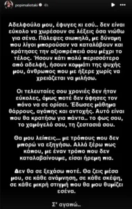 «Αδελφούλα μου, έφυγες κι εσύ.. δεν είναι εύκολο να χωρέσουν σε λέξεις όσα νιώθω για σένα. Πάλεψες σιωπηλά, με δύναμη που λίγοι μπορούσαν να καταλάβουν και κράτησες την αξιοπρέπειά σου μέχρι το τέλος. Ήσουν κάτι πολύ περισσότερο από αδελφή, ήσουν κομμάτι της ψυχής μου, άνθρωπος που με ήξερε χωρίς να χρειάζεται να μιλήσω.