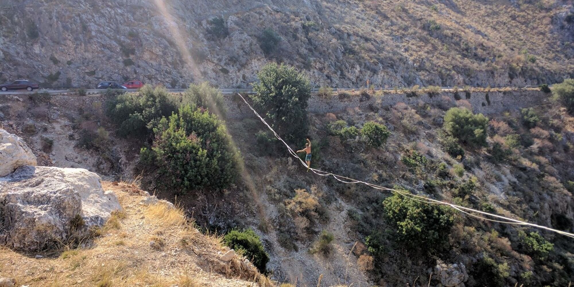 Με κομμένη την ανάσα οι περαστικοί οδηγοί είδαν σήμερα το πρωί στη διαδρομή Αργοστόλι – Ληξούρι στη θέση «του Ποντικού τ’ αυλάκι» έναν άγνωστο ακροβάτη να το περνάει, ακροβατώντας σε σχοινί και χωρίς κανένα ίχνος προστασίας.