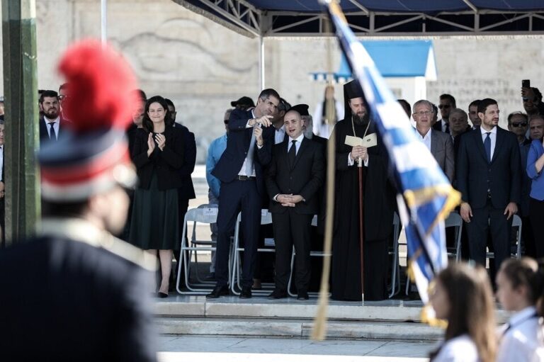 Οι επίσημοι χειροκροτούν τους πρωταγωνιστές των εορτασμών της εθνικής επετείου EUROKINISSI/ΣΤΕΛΙΟΣ ΜΙΣΙΝΑΣ