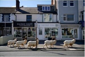 Τράγοι περπατούν στος δρόμους της πόλης Λαντούντνο, της Ουαλίας, στις 31 Μαρτίου, 2020.