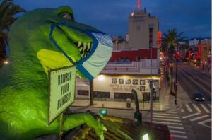 Ο δεινόσαυρος που κοσμεί την οροφή του καταστήματος, «Ripley’s Believe It or Not!», στο Λος Άντζελες, ενώ φοράει την μάσκα του, στην μάχη κατά του κορονοϊού. Κυριακή του Πάσχα, 19 Απριλίου, 2020.