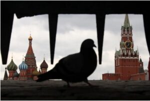 Ένα περιστέρι στέκεται μπροστά στην Ιβηρική Πύλη, στην Κόκκινη Πλατεία, στην Μόσχα, στις 2 Απριλίου, 2020.