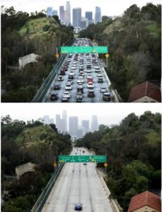 Ο αυτοκινητόδρομος 110, στο Λος Άντζελες, σε ώρα αιχμής κατά τις πρωινές ώρες, πριν και μετά την απαγόρευση κυκλοφορίας, λόγω κορονοϊού.