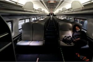 Ένας επιβάτης ενώ κοιμάται σε έναν από τους συρμούς της εταιρείας Amtrak, ενώ εισέρχεται στον σταθμό Πεν, της Βαλτιμόρης, στην πολιτεία του Μέριλαντ