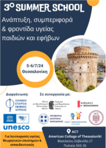 Με θέμα την «Ανάπτυξη, συμπεριφορά και φροντίδα υγείας παιδιών και εφήβων» διεξάγεται το 3ο Summer School της Ελληνικής Εταιρείας Εφηβικής Ιατρικής (Ε.Ε.Ε.Ι.), το οποίο θα πραγματοποιηθεί σε συνεργασία με την Περιφέρεια Κεντρικής Μακεδονίας και άλλους φορείς στην Θεσσαλονίκη, 5-6 Ιουλίου 2024.