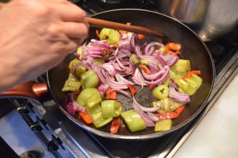 Σε λίγο ελαιόλαδο τηγανίζουμε πρώτα ελαφριά για 5΄ το λουκάνικο και μετά βγάζοντας το, για άλλο τόσο χρόνο τις πιπεριές.