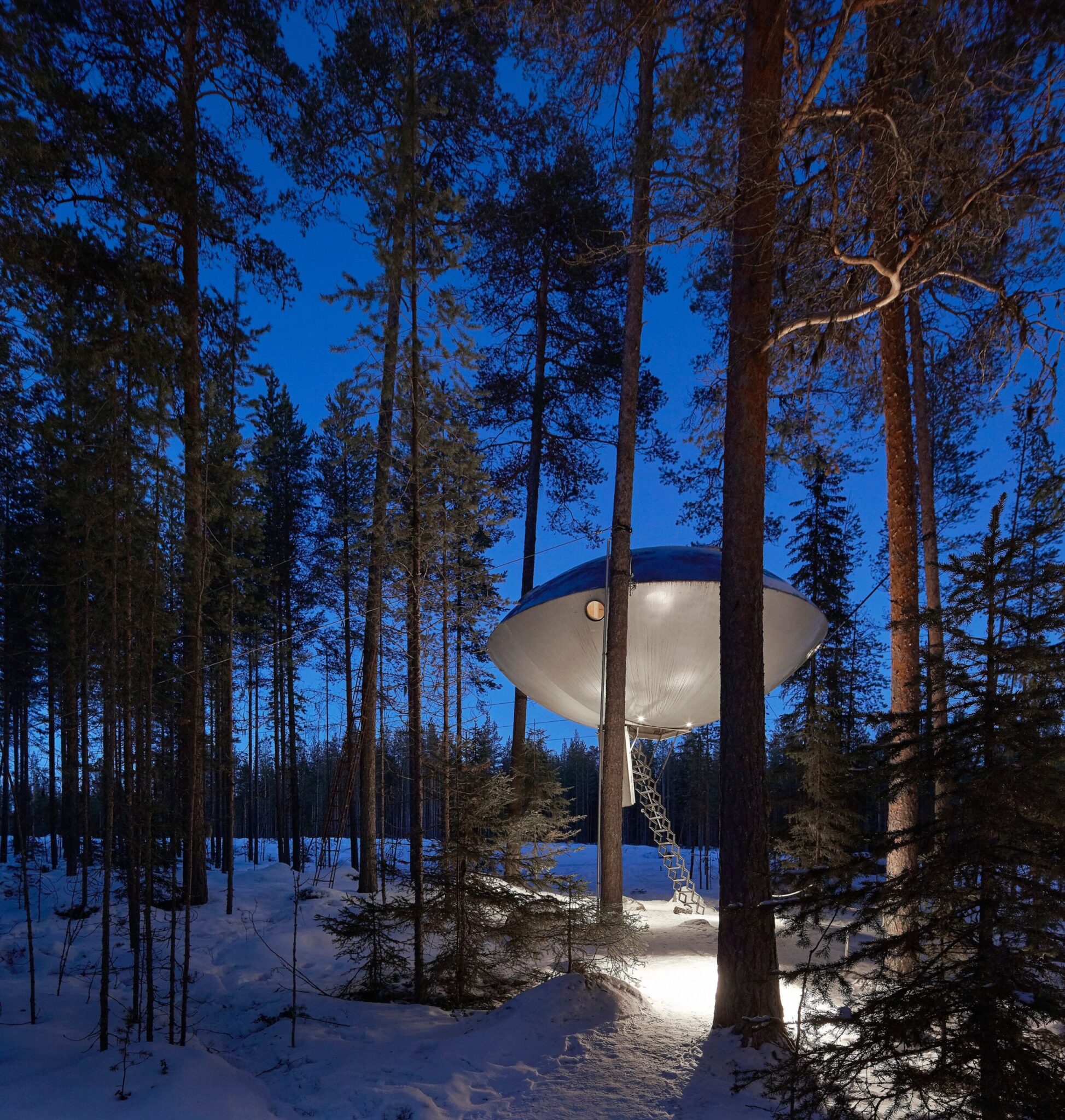 Το Treehotel ξεπερνάει κάθε φαντασία. Το ξενοδοχείο προσφέρει πολλά δωμάτια ανάμεσα στα μεγάλα κλαδιά των δέντρων, συμπεριλαμβανομένης μιας κατασκευής τύπου διαστημόπλοιου και έναν κύβο του οποίου οι τοίχοι είναι καθρέφτες.