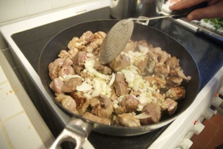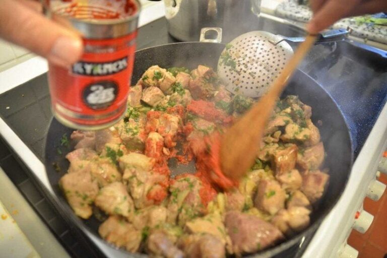 Σε φαρδιά κατσαρόλα ροδίζουμε (θωρακίζουμε) το ψιλοκομμένο κρέας σε ελαιόλαδο για 5-6′. Προσθέτουμε τα κρεμμύδια, ψιλοκομμένα, και τα αφήνουμε να γίνουν διάφανα. Προσθέτουμε το σκόρδο, ψιλοκομμένο, και ανακατεύουμε. Με κουτάλι τρίβουμε τον πελτέ ντομάτας στη βάση της κατσαρόλας για να βγάλει τα αρώματά του. Σβήνουμε με τη Ρομπόλα και ανακατεύουμε καλά. Προσθέτουμε το νερό. Χαμηλώνουμε τη φωτιά, σκεπάζουμε και σιγοβράζουμε για περίπου 1 ώρα, μέχρι να μαλακώσει καλά το κρέας.