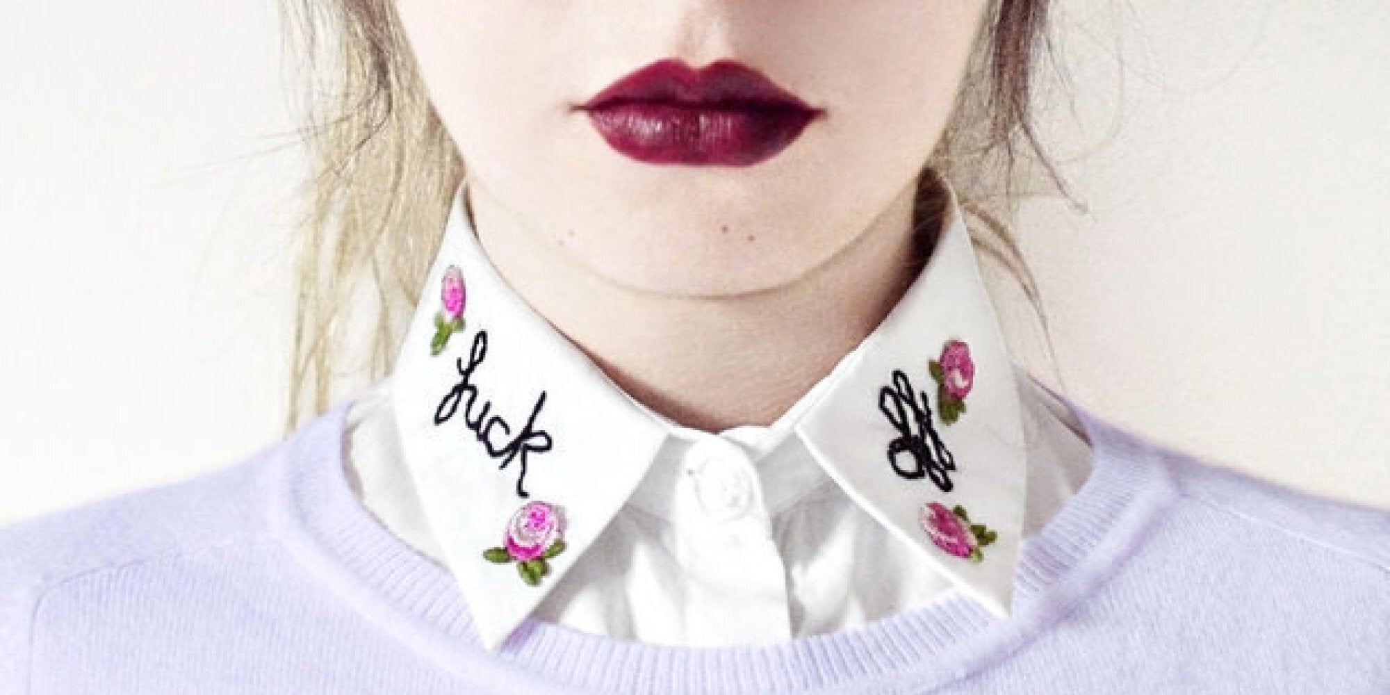 Ναι, σωστά είδατε, ανάμεσα στα λουλουδάκια βρίσκεται ένα ξεκάθαρο μήνυμα σε όλους εκείνους που σας υποτιμούν ή πολύ απλά σας χαλάνε τη μέρα και τη διάθεση. Βέβαια, ίσως τα περισσότερα από τα σχέδια των εταιρειών στο Etsy WTFembroidery και CollarMePrettyCo να μην είναι κατάλληλα για το εργασιακό περιβάλλον, αλλά μπορούν άνετα να φορεθούν όλες τις υπόλοιπες ώρες της ημέρας.