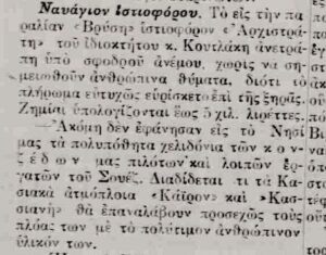 Το πιο πάνω απόσπασμα γράφτηκε στην εφ. «Αυγή της Καρπάθου» ιδιοκτησίας του Βωλαδιώτη Κάσσιου το 1937, με αφορμή μια δύσκολη στιγμή μέσα στη θάλασσα.