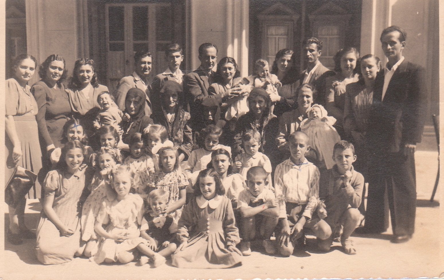 Οικογένεια Λάμπρου γύρω από την γιαγιά Κωνσταντάκαινα, έξω από το σπίτι της θείας Βαγγέλας στο ρυάκι, 1947