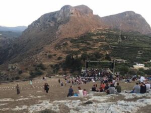Φτάσαμε στο αεροδρόμιο των Χανίων και μας παρέλαβε η Μέτη. «Οι Γιορτές Ρόκκας, είναι μία συλλογική προσπάθεια των κατοίκων των δύο χωριών. Της Ρόκκας και της Κεράς. Όλο το χωριό για 20 και πλέον ημέρες δεν έχει ησυχάσει. Δέχεται κόσμο και προσπαθεί να τον κάνει περάσει όσο καλύτερα γίνεται.» Αφήσαμε πίσω μας τη θάλασσα και αρχίσαμε να ανεβαίνουμε. Η διαδρομή, πιο εύκολη και πιο σύντομη απ’ ότι αρχικά περίμενα. Ξεναγός μας ο πολυπράγμων και ερωτευμένος με τον τόπο του, Παναγιώτης Σημανδηράκης. Κάθε στροφή του δρόμου και μία ιστορία. Μας δείχνει τον θεόρατο βράχο, το τρουλί, που στέκεται πάνω από το χωριό. «Εκεί θα πάμε. Εκεί είναι ο αρχαιολογικός χώρος που θα γίνει η συναυλία.»
