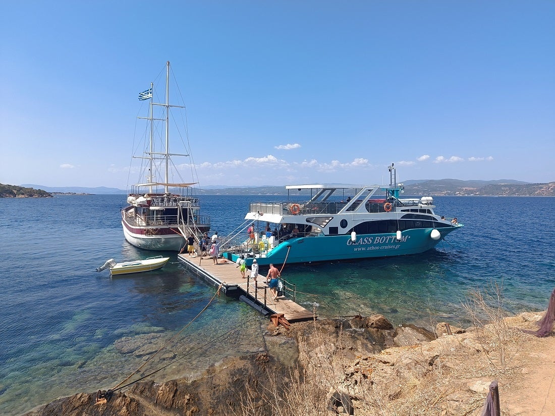 Ήταν η δεύτερη φορά, μέσα σε μια πενταετία, που πήγα με σκάφος του Φώτη Ροδοκαλάκη μονοήμερη κρουαζιέρα. Καθημερινά, έως και τον Νοέμβριο, από τον Όρμο Παναγιάς κάνει κρουαζιέρες με τα πέντε πλοία που διαθέτει, στον κόλπο του Αγίου Όρους από το δεύτερο στο τρίτο πόδι της Χαλκιδικής. Ξεκινά στις 9.30 και επιστρέφει στις 5 το απόγευμα.