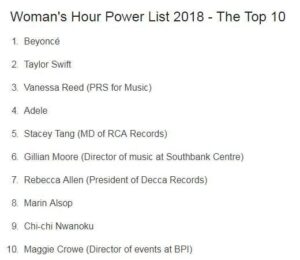 Στην τρίτη θέση για παράδειγμα, βρίσκεται η Vanessa Reed, η οποία ως διευθύντρια του PRS Foundation, κατάφερε να πείσει δεκάδες φεστιβάλ να υπογράψουν τη συμφωνία του 50-50 για την εκπροσώπηση των φύλων στα line-up των διοργανώσεων έως το 2022.