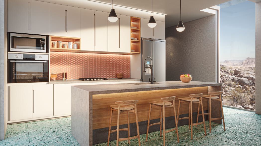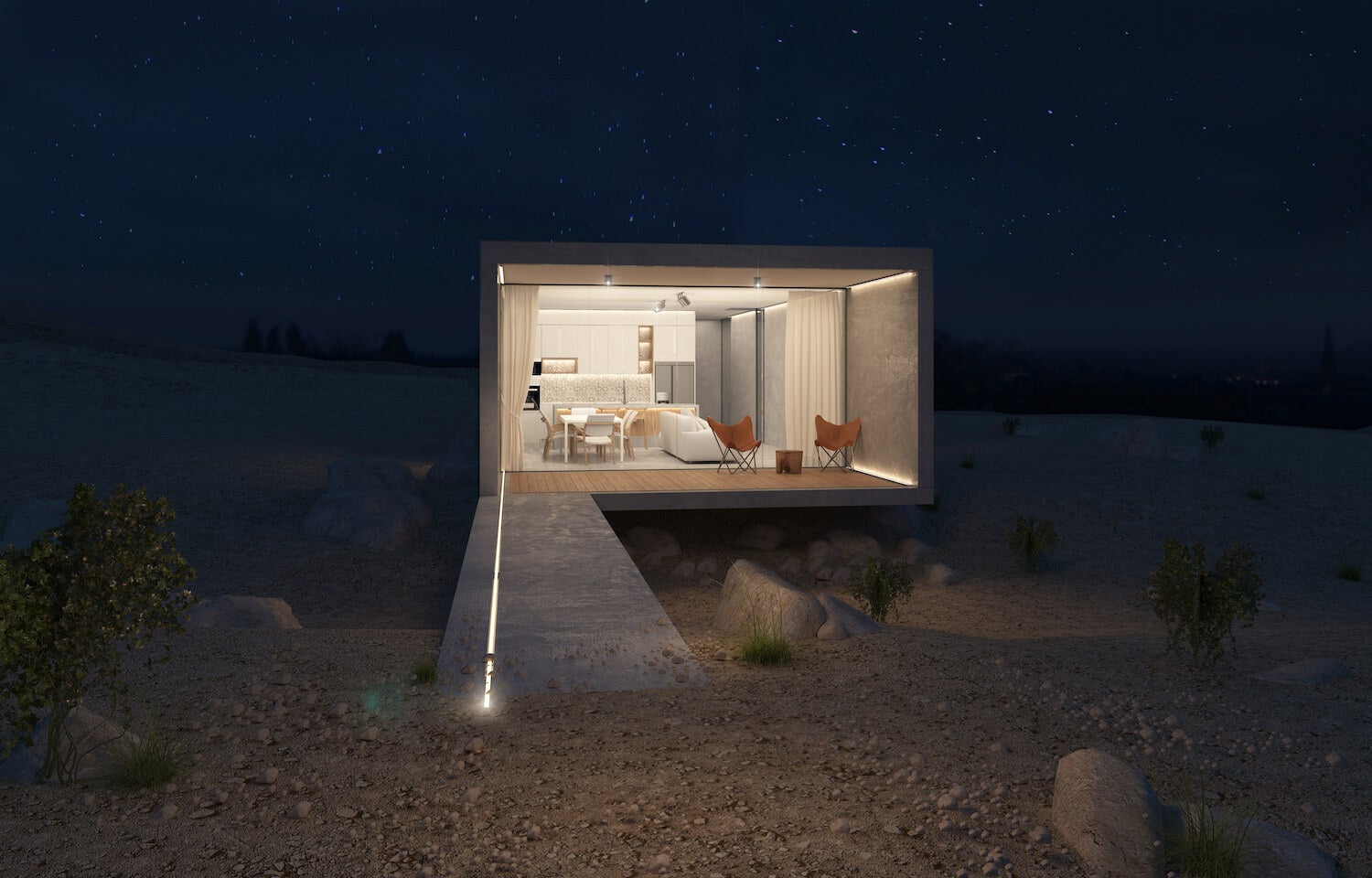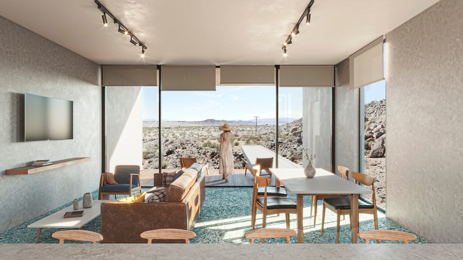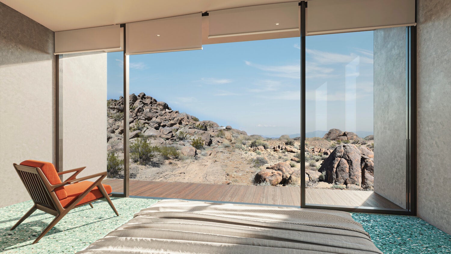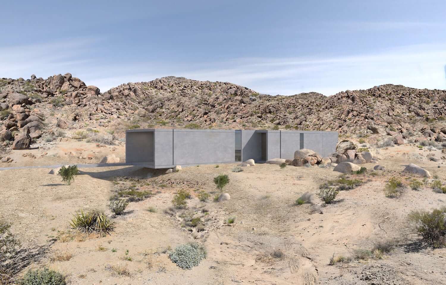 Το μίνιμαλ σπίτι είναι χτισμένο ανάμεσα στους βράχους, σε απομονωμένο σημείο της ερήμου Μοχάβι, στην Καλιφόρνια των ΗΠΑ και βρίσκεται σε άμεση επαφή με το φυσκό περιβάλλον.