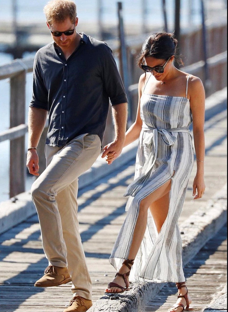 Η Μάρκλ επέλεξε για αυτήν την χαλαρή εμφάνιση ένα οικολογικό αέρινο μακρύ φόρεμα Reformation, με μεγάλο σκίσιμο στο πλάι στις αποχρώσεις του γκρι και καφέ σανδάλια Sarah Flint, τα οποία έχει ξανά προτιμήσει σε παλαιότερη εμφάνιση.