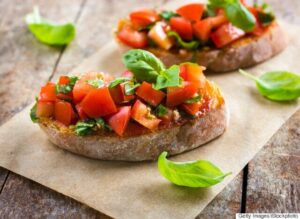 Ξεπλένετε τις ντομάτες και στη συνέχεια της κόβετε σε κυβάκια και τις τοποθετείτε σε ένα μπολ. Κόψτε λίγο βασιλικό με τα χέρια σας και ρίξτε τον στο μπόλ. Προσθέστε λίγο πιπέρι, μια λιωμένη σκελίδα σκόρδο, ρίγανη και μια πρέζα αλάτι στο μείγμα. Ανακατέψτε καλά και στη συνέχεια αφαιρέστε το σκόρδο. Εν τω μεταξύ ετοιμάστε το ψωμί. Το χτεσινό ψωμί είναι πάντα καλύτερο, αλλα αν είναι φρέσκο, τότε ψήστε το για λίγα λεπτά για να στεγνώσει. Κόψτε το ψωμί, ψήστε το στην τοστιέρα και τρίψτε λίγο φρέσκο σκόρδο πάνω σε κάθε φέτα. Μοιράστε το μείγμα ντομάτας στις φέτες του ψωμιού και περιχύστε κάθε φέτα με λίγο ελαιόλαδο.