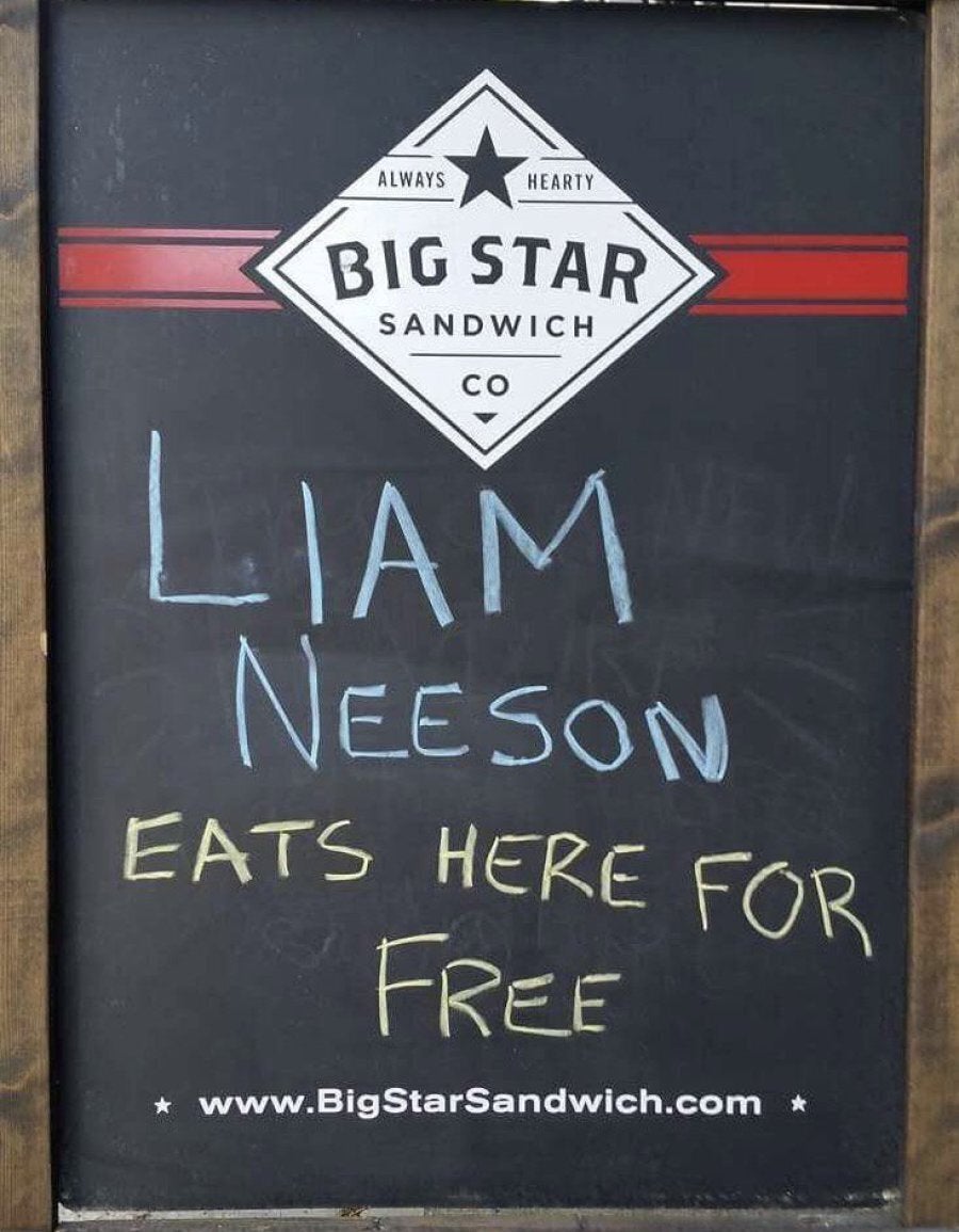 Την απάντηση έδωσαν οι ιδιοκτήτες του «Big Star Sandwich Co.» στο New Westminster του Καναδά, με αυτόν τον πίνακα έξω από το μαγαζί τους, στον οποίο αναγράφεται η φράση «O Liam Neeson τρώει εδώ δωρεάν».