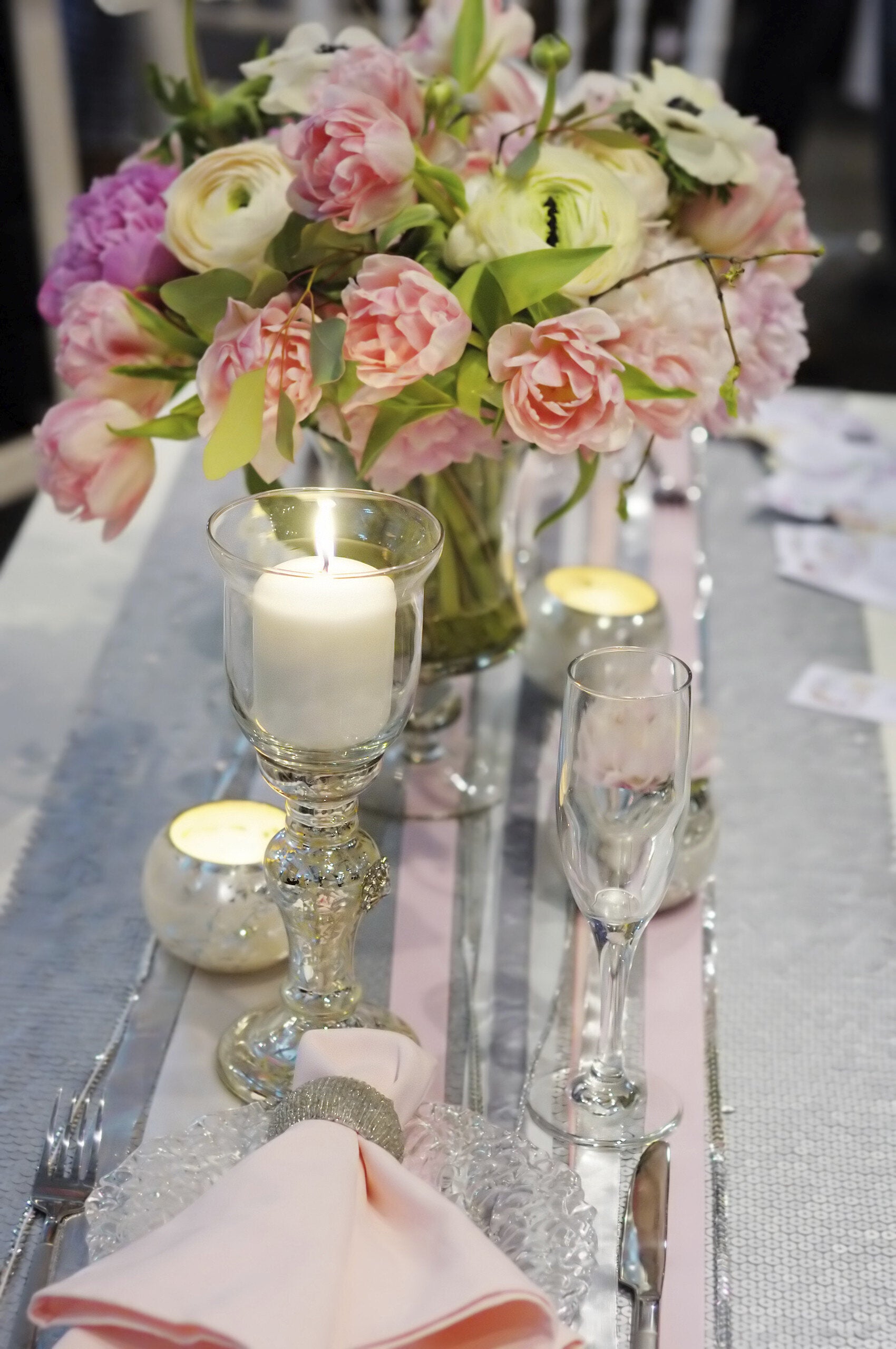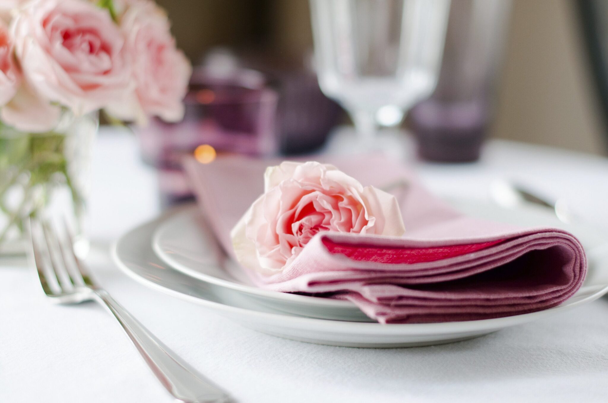 - Δύο είναι οι λέξεις κλειδιά: λουλούδια και κεριά. Γεμίστε ένα μεγάλο βάζο με εντυπωσιακά ροζ τριαντάφυλλα και δώστε προσοχή στη λεπτομέρεια που θα κάνει τη διαφορά: βάλτε ένα λουλούδια μέσα στην πετσέτα κάθε πιάτου. Τα κεριά πρέπει να είναι μικρά και πολλά, κατά μήκος του τραπεζιού.