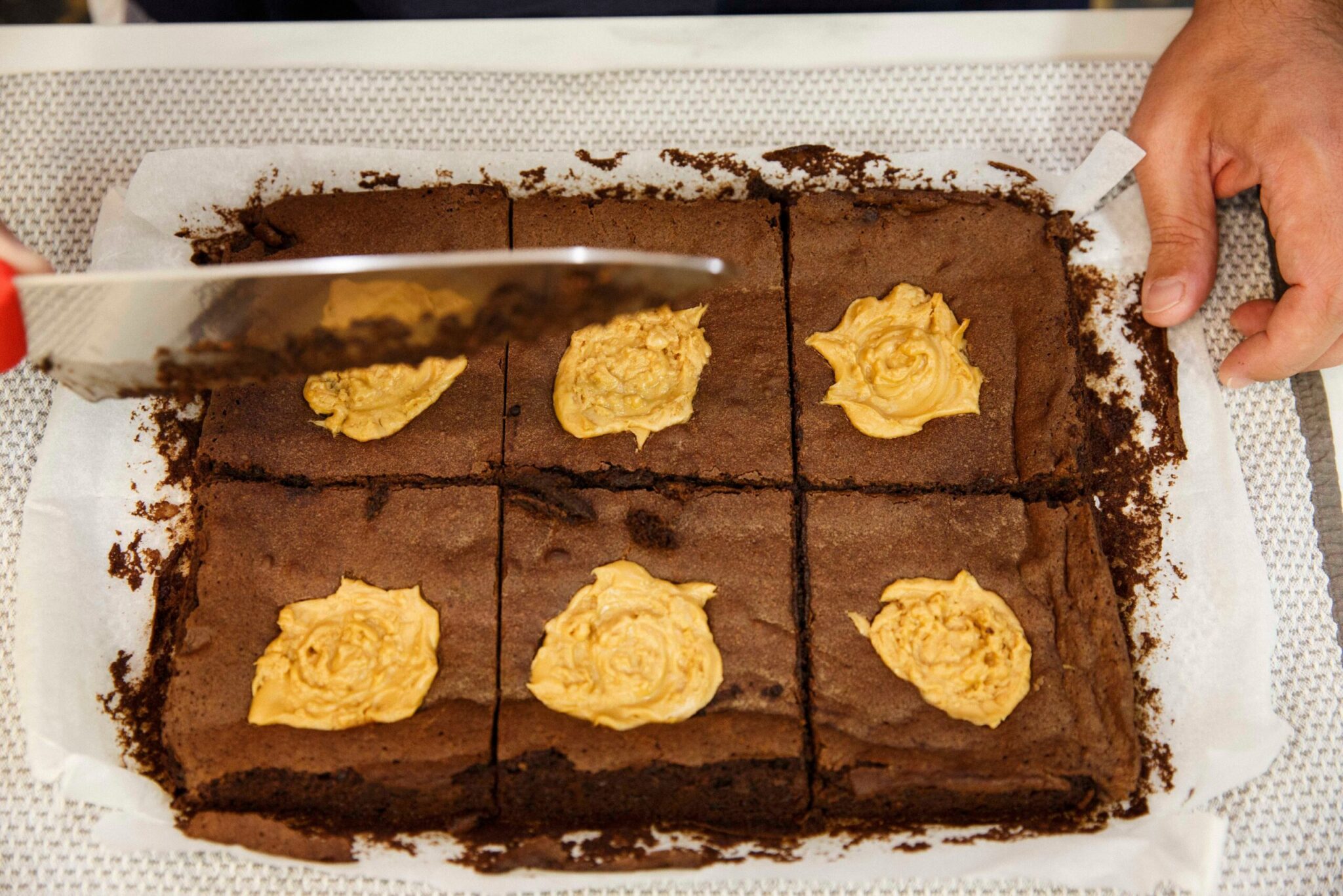 Με ένα κουτάλι ρίχνετε στην επιφάνεια του γλυκού διάσπαρτες κουταλιές φυστικοβούτυρο και ψήνετε στους 165οC για 15’. Αφήνετε να κρυώσει καλά πριν κόψετε σε κομμάτια.