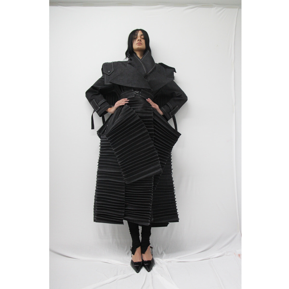 Η συλλογή, όπως ανέφερα και παραπάνω, είναι μια εξ ολοκλήρου prét a porter συλλογή. Χαρακτηρίζεται από τη βάση που έδωσα στην κατασκευή του πατρόν και του tailoring, αλλά και από τις προσωπικές μου υφές που δημιούργησα πάνω σε υφάσματα-βάσεις, όπως το denim, το βαμβάκι, το jersey και το faux leather. Απευθύνεται στα άτομα που αναζητούν μια αποστασιοποίηση από τα εφήμερα trends, τα οποία θέλουν διαχρονικά, αλλά και πάντα επίκαιρα κομμάτια στην ντουλάπα τους, που λόγω του γεγονότος ότι δεν επαναλαμβάνονται τεμαχιακά, θα είναι και οι μοναδικοί κάτοχοί τους.