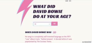 Εάν αναρωτιέστε τι έκανε ο David Bowie όταν ήταν στην ηλικία σας (όποια κι αν είναι αυτή, επιτρέψτε μου να σας συστήσω την ιστοσελίδα supbowie.com, στην οποία αν βάλετε την ηλικία σας μπορεί να σας πει με ακρίβεια σε ποια φάση βρισκόταν ο Bowie εκείνη τη στιγμή της ζωής του.