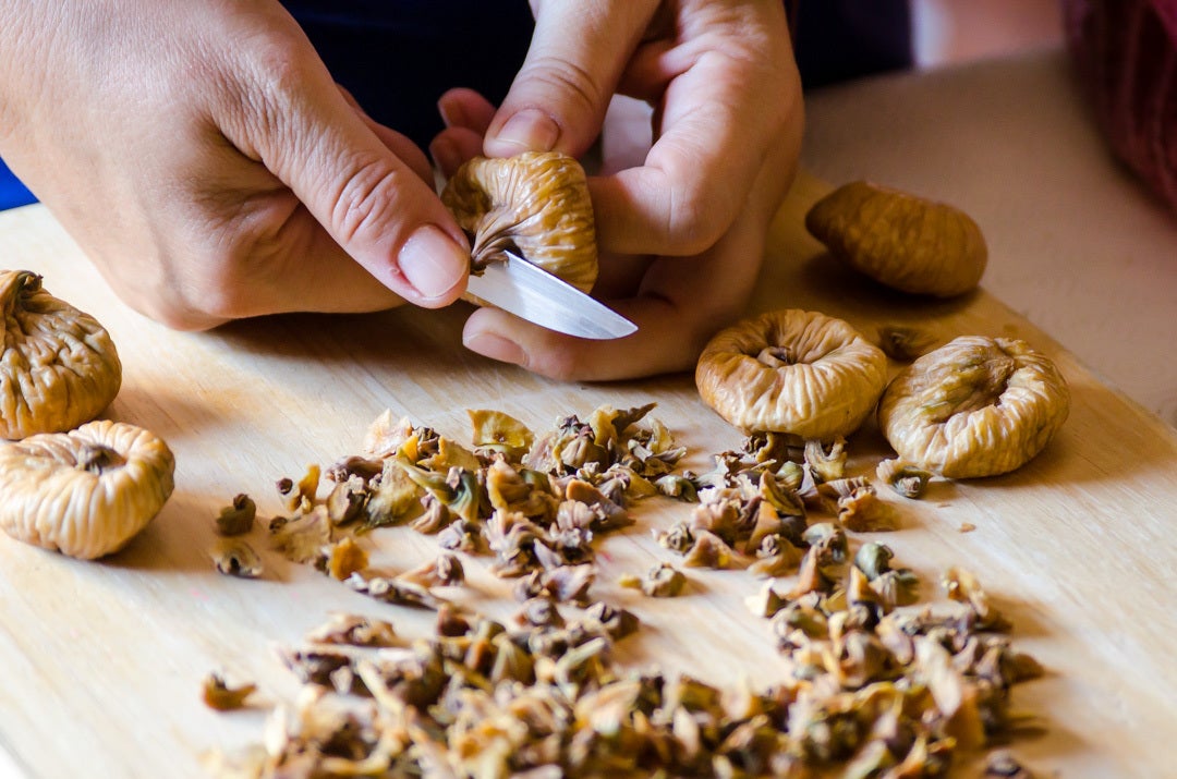 Βήμα 1ο: Εφόσον έχουμε ξεπλύνει τις τσαπέλες αφαιρούμε με ένα μαχαίρι τις μύτες (το σκληρό μέρος του σύκου). Στη συνέχεια κόβουμε τα σύκα σε λεπτές ροδέλες.