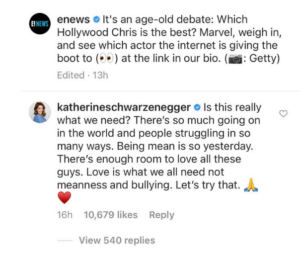 Η πρωτότοκη κόρη του Αρλοντ Σβαρτσενέγκερ και συγγραφέας παιδικών βιβλίων απάντησε αποτιμώντας τις απαντήσεις ως «κακία και εκφοβισμό»: «Είναι αυτό ακριβώς που χρειαζόμαστε; Υπάρχουν τόσα πολλά στον κόσμο και οι άνθρωποι αγωνίζονται με πολλούς τρόπους», έγραψε στο σχόλιό της. «Το να είσαι κακός είναι τόσο χθες. Υπάρχει αρκετός χώρος για να αγαπήσουμε όλα αυτά τα παιδιά. Η αγάπη είναι αυτό που όλοι χρειαζόμαστε κι όχι η κακία κι ο εκφοβισμός. Ας το δοκιμάσουμε».
