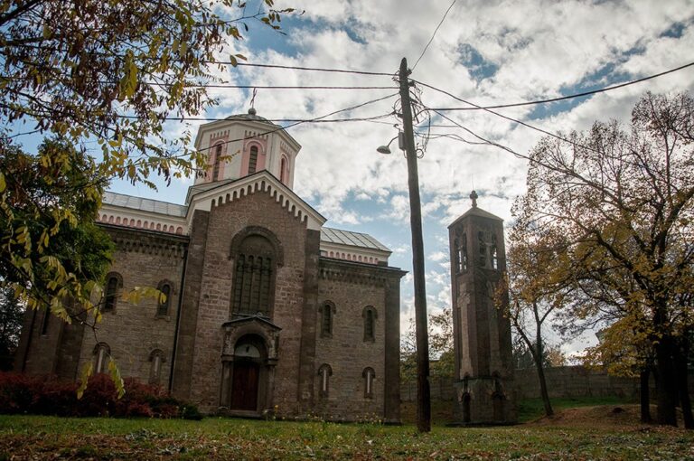 Ξεκίνησα να ανηφορίζω στο λόφο. Αρχικά, συνάντησα την εκκλησία του Αγίου Δημητρίου, χτισμένη το 2005 σε περίοπτη θέση να ατενίζει απέναντι τους μιναρέδες από το τζαμί και ολόκληρη την πόλη. Συνέχισα μέχρι την κορυφή, στο Μνημείο των Μεταλλωρύχων της Μιτρόβιτσα.