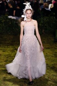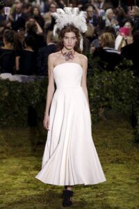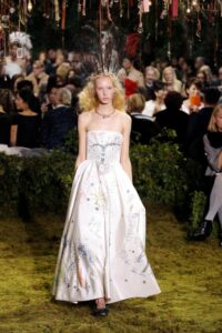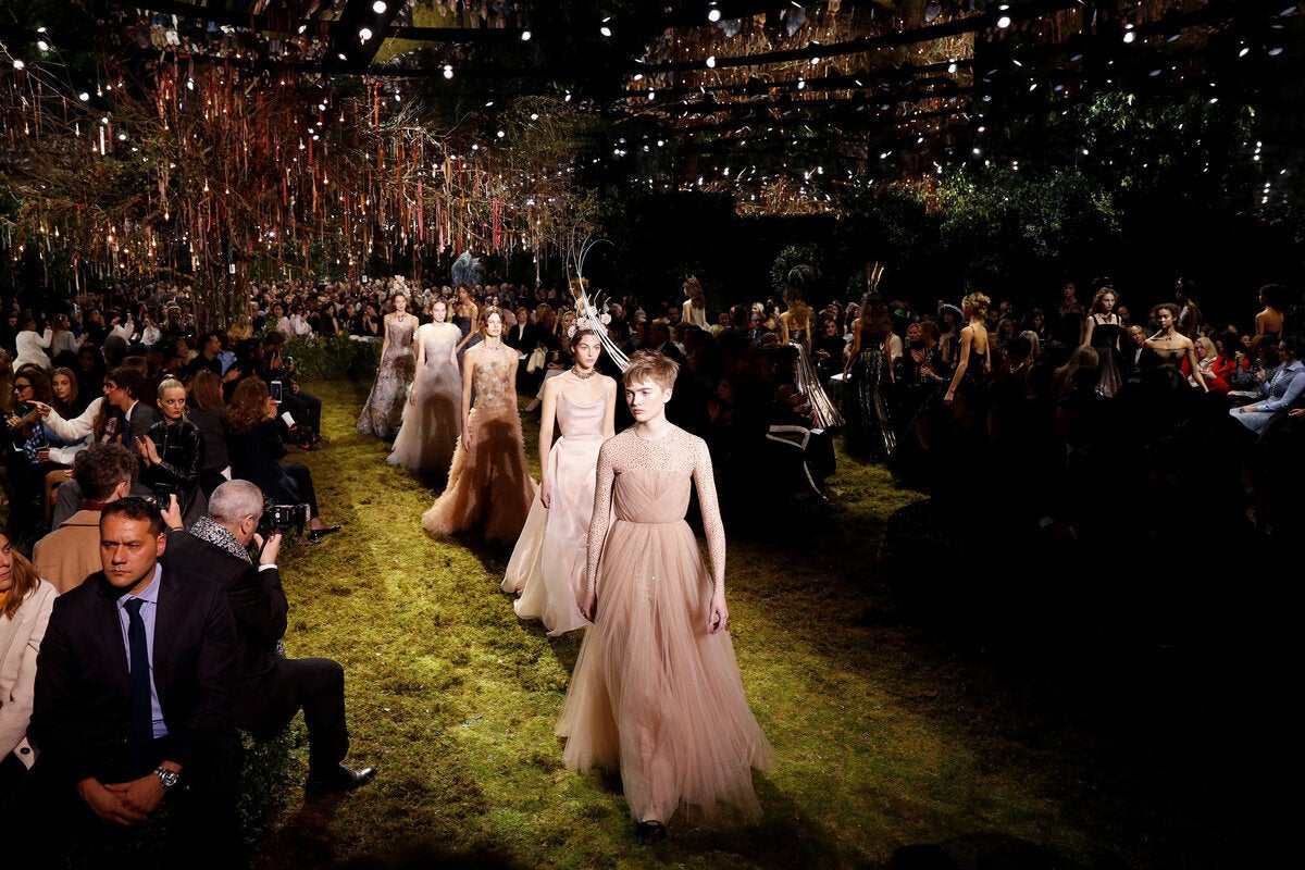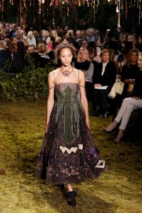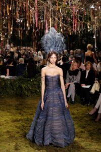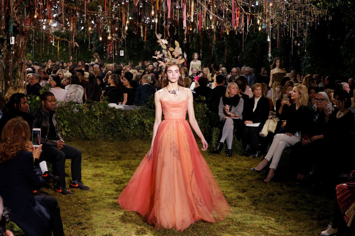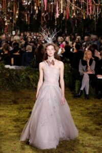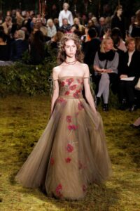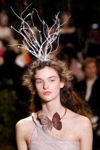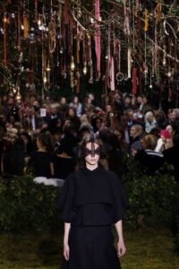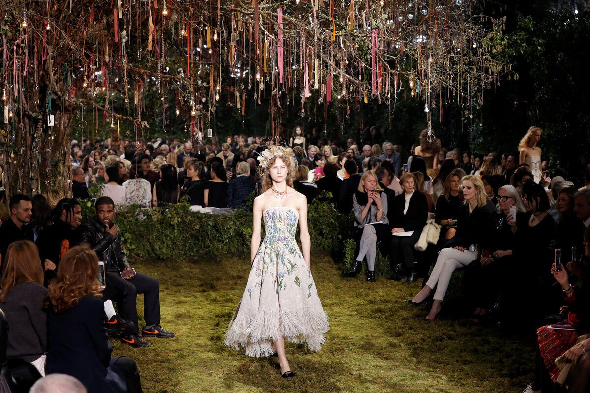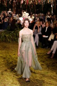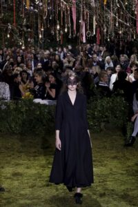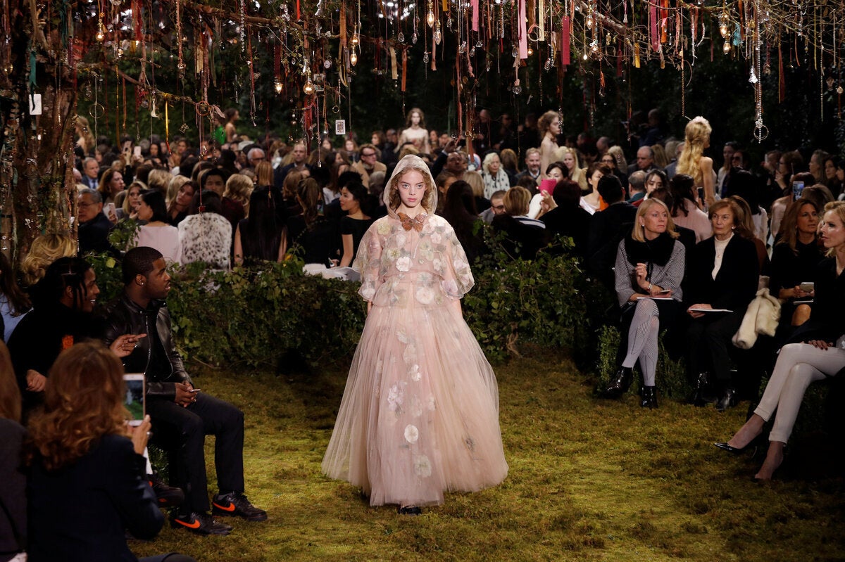 Υπήρχαν επίσης αέρινα φορέματα συνδυασμένα με υπέροχα λουλούδια στο κεφάλι, σχεδιασμένα από τον Stephen Jones, με τα μοντέλα να μοιάζουν με νύμφες που αιωρούνται μέσα σε αυτόν τον ονειρεμένο κήπο.