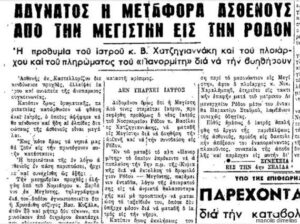 Ο Καστελλορίζιος Βασίλης Χατζηγιανάκης, νέος ακτινολόγος γιατρός του Νοσοκομείου της Ρόδου, προθυμοποιήθηκε να ταξιδέψει, έπρεπε να βρεθεί λύση για την 23χρονη Χρυσάνθη, η ζωή της κρεμόταν από μια κλωστή.