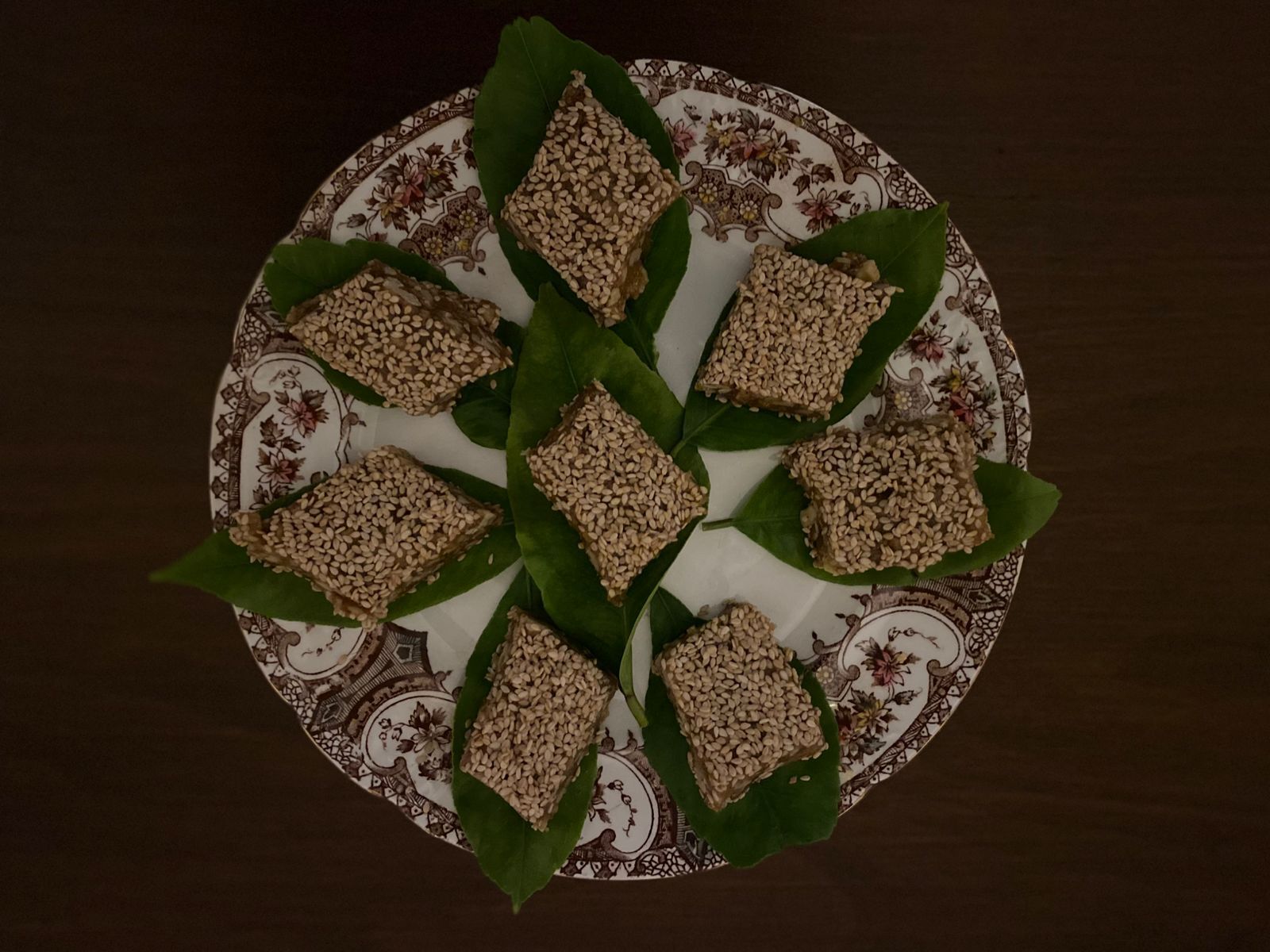 Βρέχουμε ελαφρά τις παλάμες μας με το νερό και ραντίζουμε με αυτό την επιφάνεια. Στη συνέχεια, στρώνουμε σουσάμι σε όλη την επιφάνεια. Ρίχνουμε το μείγμα από την κατσαρόλα πάνω στο σουσάμι.