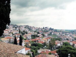 Ανεβαίνοντας τον κεντρικό δρόμο που ενώνει τον νέο οικισμό με τον διατηρητέο, ένα δρόμο που οι ντόπιοι αποκαλούν «κόντρα», το τοπίο αλλάζει. Οι πολυκατοικίες του σύγχρονου οικισμού και η αυστηρή ιπποδάμεια ρυμοτομία, δίνουν τη θέση τους στα στενά φιδωτά δρομάκια και τα χαμηλά σπίτια. Πολλά από αυτά, πέτρινα με κεραμοσκεπές και μικρούς κήπους, γεμάτους με λουλουδιασμένους τενεκέδες, αποτελούν ιδανικό φόντο για ατελείωτες selfies. Ανάμεσά τους, νεοκλασικά, αλλά και πέτρινα αρχοντικά παραδοσιακής αρχιτεκτονικής με ξύλινα σαχνισιά, ψιθυρίζουν ιστορίες ευμάρειας, δημιουργίας και δύναμης.