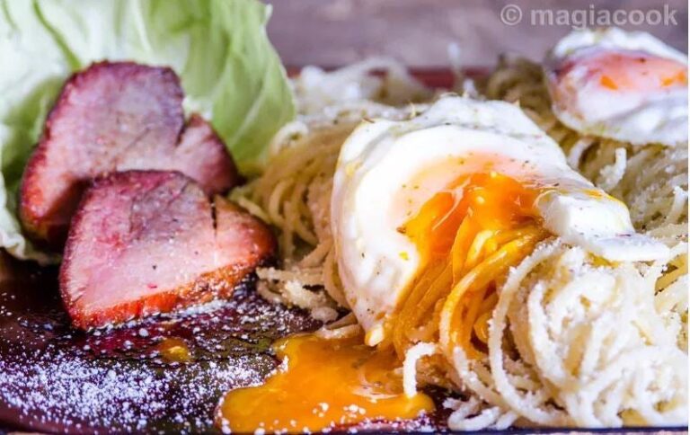 Μέχρι να βράσουν τα μακαρόνια βάζουμε λίγο ελαιόλαδο σε ένα τηγάνι. Τηγανίζουμε ένα με δύο αβγά ανά μερίδα. Τα αβγά τα θέλουμε μελάτα γι’ αυτό τα τηγανίζουμε σε εστία μεσαίας έντασης.