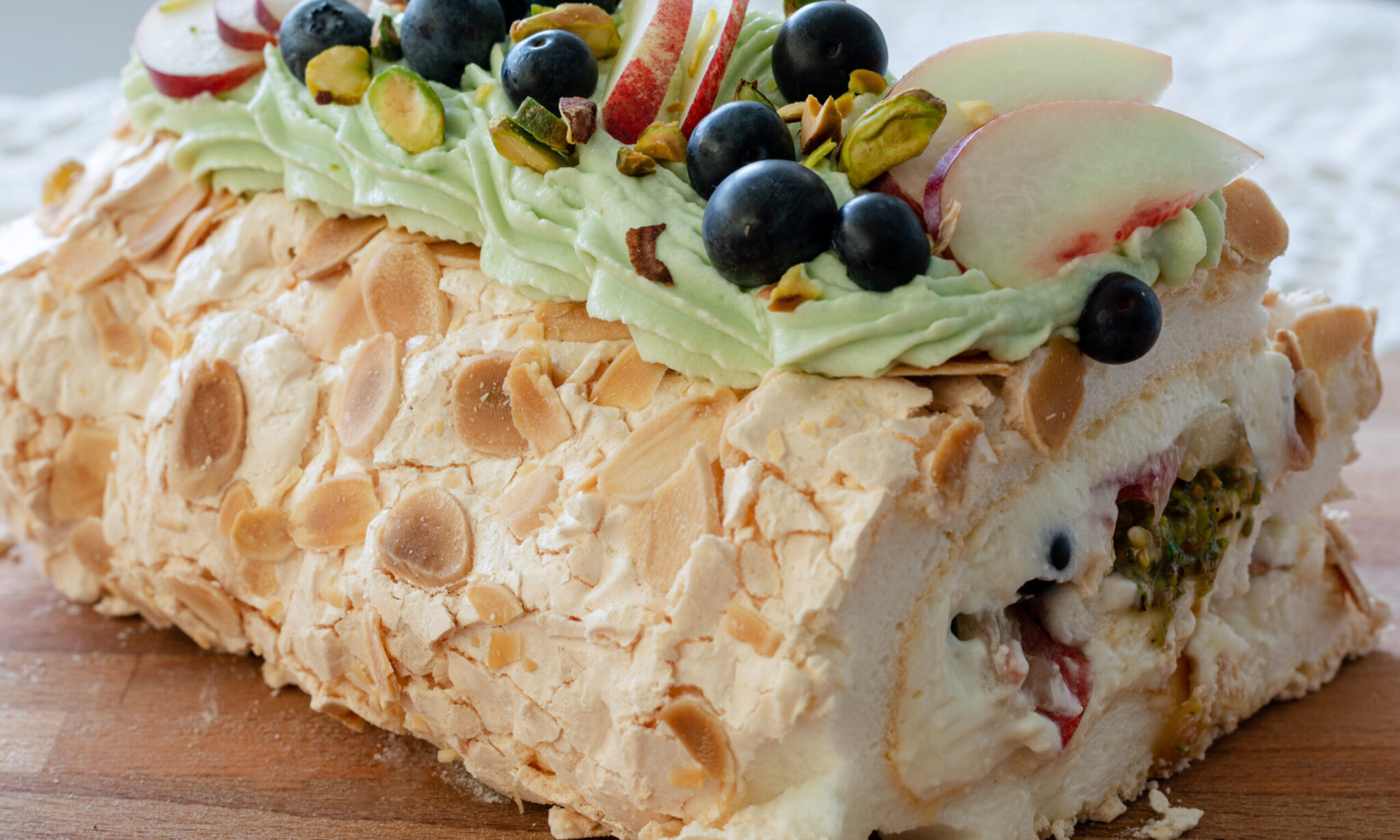 Κορμός μαρέγκας με ροδάκινα κομπόστα