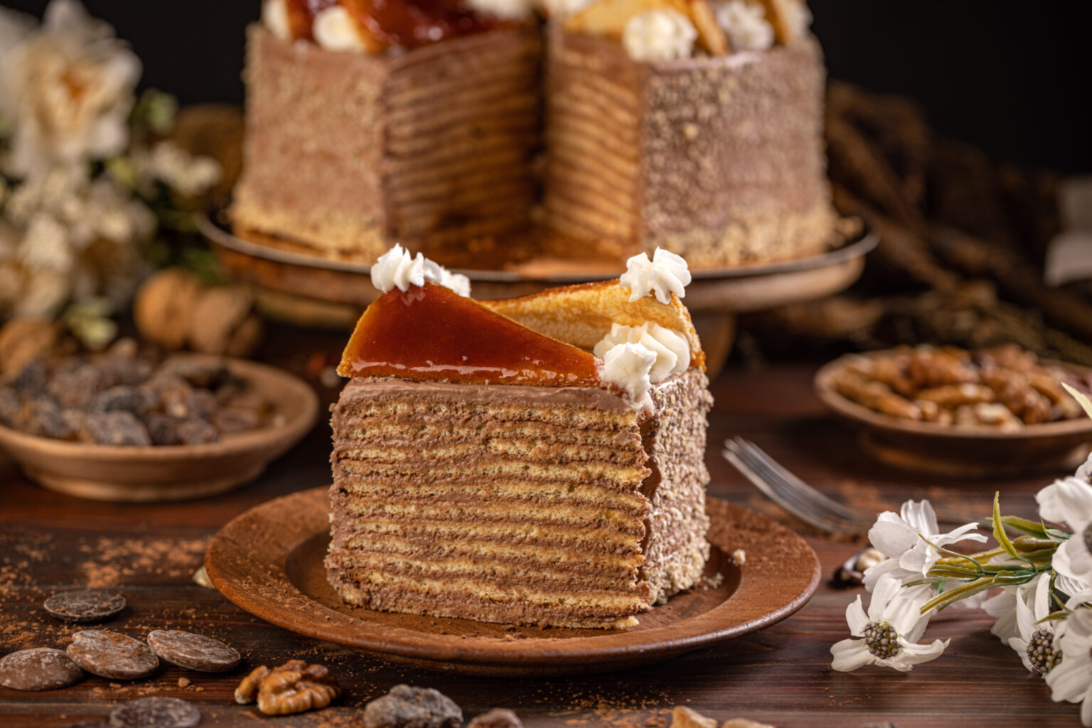 Για επιδόρπιο, γλυκό ταψιού σε στρώσεις, με καρύδια και μαρμελάδα βερίκοκο.