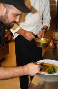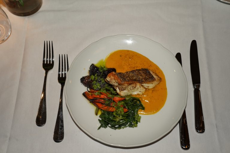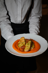 Από το μεσημεριανό και βραδινό μενού δοκιμάσαμε τα χειροποίητα στριφτάρια που “παντρεύτηκαν” σε ένα πιάτο με γαρίδες σαγανάκι και συνοδεύονται με γραβιέρα, φέτα και κρόκο Κοζάνης, ένα πολύ τρυφερό στήθος από κόκκορα με πουρέ γλυκοπατάτας και την τέλεια φρέσκια σφυρίδα με χόρτα εποχής και λαδολέμονο με κρόκο Κοζάνης