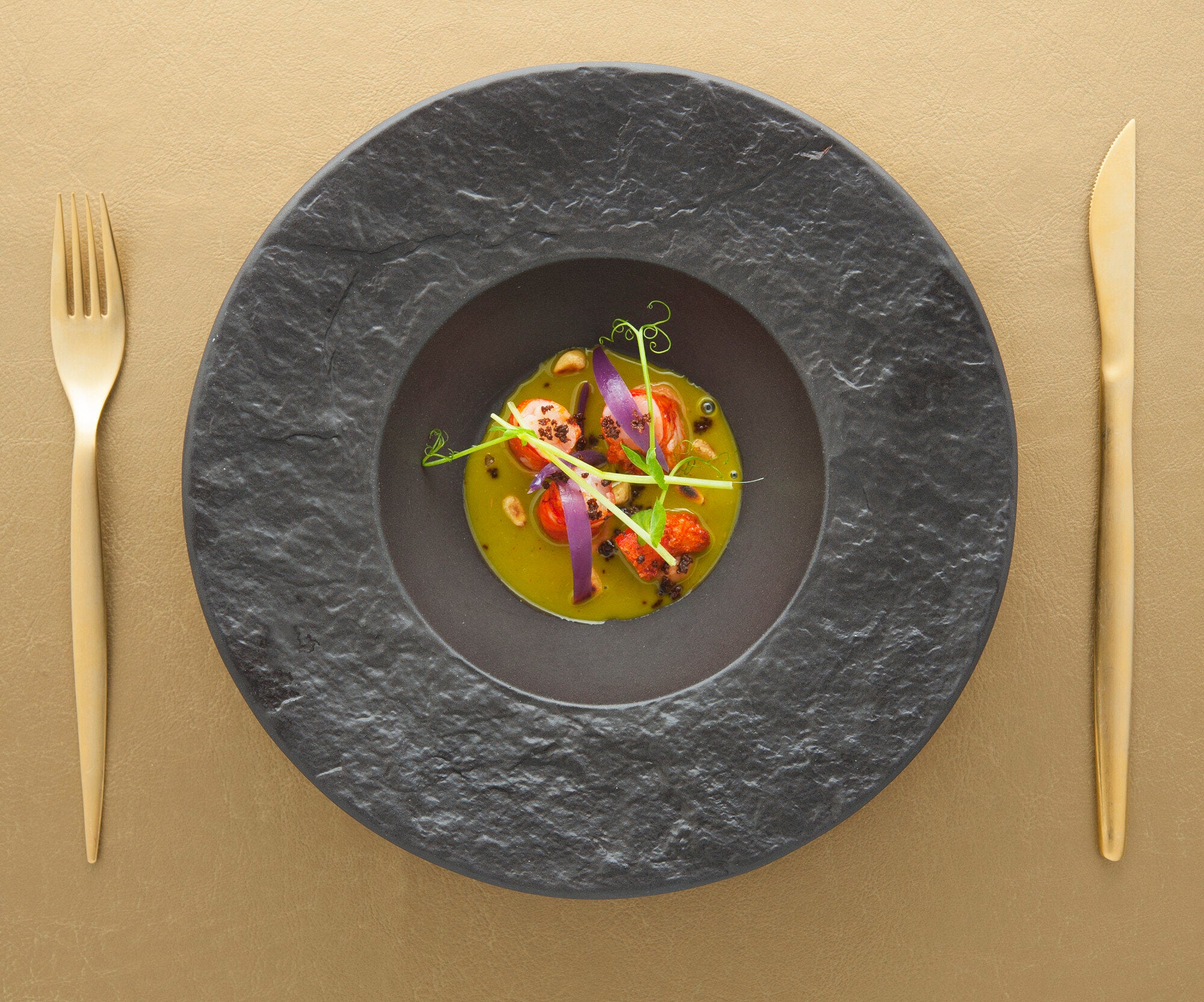 Στο εστιατόριο του στη Μάλαγα το μενού αλλάζει φυσικά ανάλογα με την εποχή, αλλά αυτό με το οποίο έχει σταθερά εμμονή είναι ο «χυμός» που μπορεί να βγάλει από κάθε υλικό, αφού για εκείνον εκεί κρύβεται η γεύση και όχι στην στέρεη μορφή του. «Δεν βρίσκεται μόνο στα λαχανικά και τα φρούτα, αλλά σε όλα, όπως για παράδειγμα στο κρέας». Την επόμενη μέρα της συνέντευξης μας, είχα την τιμή να δοκιμάσω το μενού του, για το οποίο ήδη έχω γράψει εδώ και το έχω περιγράψει ως «η θάλασσα στο πιάτο μου». Ο αχινός με τον χυμό σελινόριζας και το χέλι ήταν χωρίς αμφιβολία τα πιάτα που ξεχώρισαν, αλλά θα ήταν αδικία να μην αναφερθώ και στο γλυκό, σε εκείνο το θεσπέσιο σοκολατένιο κέικ με ξινή κρέμα με μπανάνα.