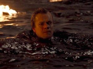 Μιλάμε φυσικά για τη σκηνή όπου ο Euron Greyjoy, αφού έχει σπείρει τον πανικό στο στόλο της Yara και της Ellaria και τον έχει, ουσιαστικά, εξολοθρεύσει, κρατά το τσεκούρι του στο λαιμό της αδερφής του Theon και τον προκαλεί να έρθει να τη σώσει. Μόνο που ο Theon, προς έκπληξη όλων, γίνεται πάλι Reek και πηδά μέσα στη θάλασσα για να σωθεί.