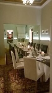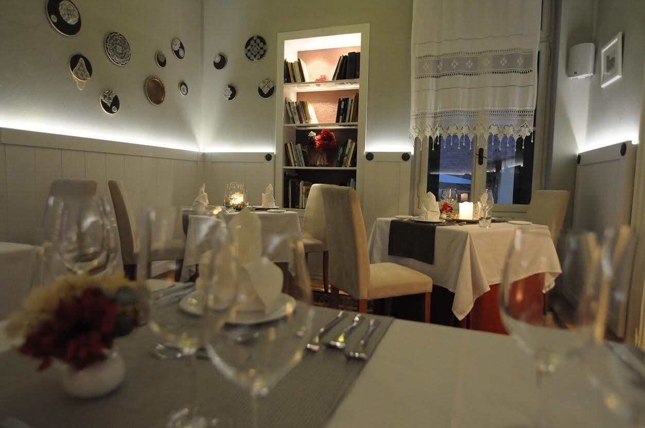Το μενού αλλάζει κάθε 2-3 μέρες και είναι 4 πιάτων. Υπάρχουν τρεις εκδοχές: χορτοφαγικό, με κρέας και με ψάρια. Η κουζίνα μας πολλές φορές εμπνέεται και από τη θεματική μας έκθεση όπως για παράδειγμα από την μοναστηριακή κουζίνα. Η τιμή του κυμαίνεται στα 24 με 26 ευρώ. Είναι μια τιμή που ίσως να ακούγεται ακριβή την εποχή της κρίσης, αλλά από την άλλη πολλοί μας θεωρούν τρελούς που δεν το έχουμε πιο ακριβό. Πολλοί μάλιστα το γράφουν και στις κριτικές τους στο Tripadvisor αυτό. Δεν στραφήκαμε στο πνεύμα της εποχής που κυνηγά το φθηνό και το μπόλικο. Στον επάνω όροφο που έχουμε το εστιατόριο, υπάρχουν ουσιαστικά 25 θέσεις, οπότε είναι και δύσκολο να έχουμε τα έσοδα που πρέπει. Εμείς υπερασπιστήκαμε ένα πιο ποιοτικό προϊόν, σε έναν πιο ήρεμο χώρο με λιγότερο κόσμο, αυτό που μας ανάγκασε δηλαδή η κρίση να εγκαταλείψουμε. Μαγειρεύουμε επίσης μόνο με φρέσκα υλικά, για αυτό αλλάζει και τόσο συχνά το μενού. Αυτό είναι η αλήθεια ότι μας κοστίζει, αλλά αυτό είναι και που τελικά αποδίδει. Ο κόσμος πριν έρθει να φάει, μας παίρνει τηλέφωνο και μας ρωτάει: «Τι θα φάμε σήμερα;» Υπάρχει αυτή η οικειότητα.