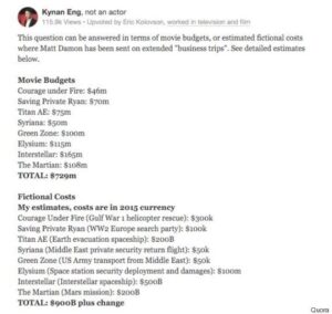 Αυτό το επαναλαμβανόμενο μοτίβο στους χαρακτήρες του Damon προβλημάτισε έναν χρήστη της πλατφόρμας Quora, τον Kynan Eng από τη Ζυρίχη ο οποίος εργάζεται στο χώρο της έρευνας και της διαφήμισης. Ο Eng λοιπόν αποφάσισε να βρει την απάντηση στο ερώτημα «Πόσα χρήματα έχουν σπαταληθεί για να φέρουμε πίσω σώο τον Matt Damon από τα μακρινά μέρη στα οποία παγιδεύεται;». Γιατί, ας είμαστε ειλικρινείς, όλοι θέλουμε να μάθουμε.