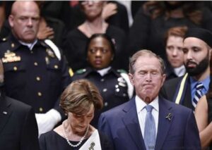 Κατά τη διάρκεια της κηδείας των πέντε αστυνομικών που σκοτώθηκαν στο Ντάλας, κι ενώ ο Bush βρισκόταν στην πρώτη σειρά των επισήμων μαζί με τη σύζυγό του, Laura Bush, τον πρόεδρο Obama και τη Michelle Obama, θεώρησε πως αυτή ήταν η τέλεια ευκαιρία για να επιδείξει τις χορευτικές του ικανότητες. Έτσι, άρχισε να λικνίζεται δεξιά-αριστερά χαμογελώντας σα χαζοχαρούμενος, ενώ η χορωδία τραγουδούσε από πίσω το «The Battle Hymn of the Republic».