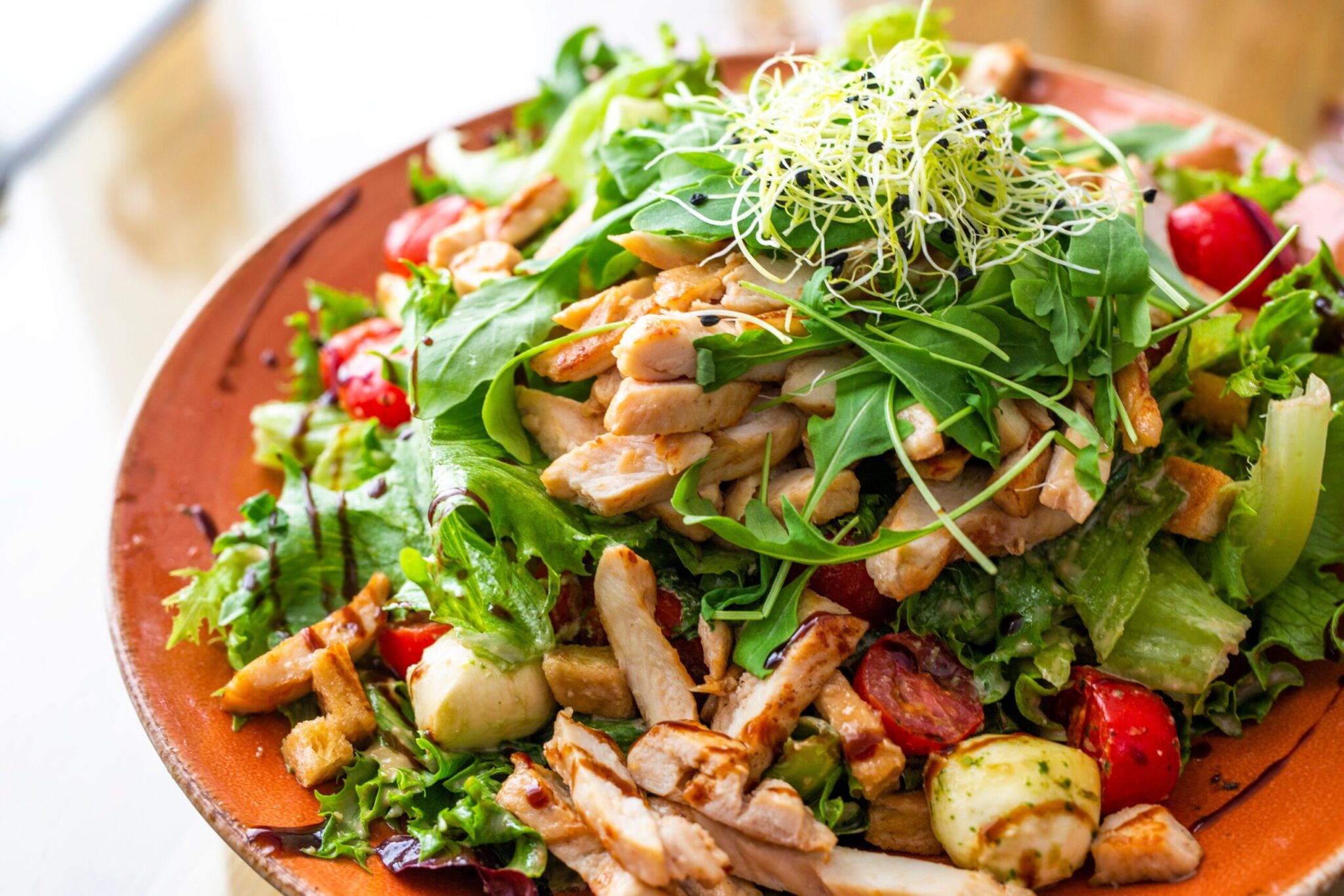 Απολαμβάνουμε μία συνταγή για σαλάτα κοτόπουλο, με σπαράγγια, κόλιανδρο, αγγούρι, αρακά, λίγο δυόσμο, σκορδάκι, φυστίκια και νουντλς με ντρέσινγκ απο φυστικοβούτυρο, μέλι, τζίντζερ και τσίλι σως.