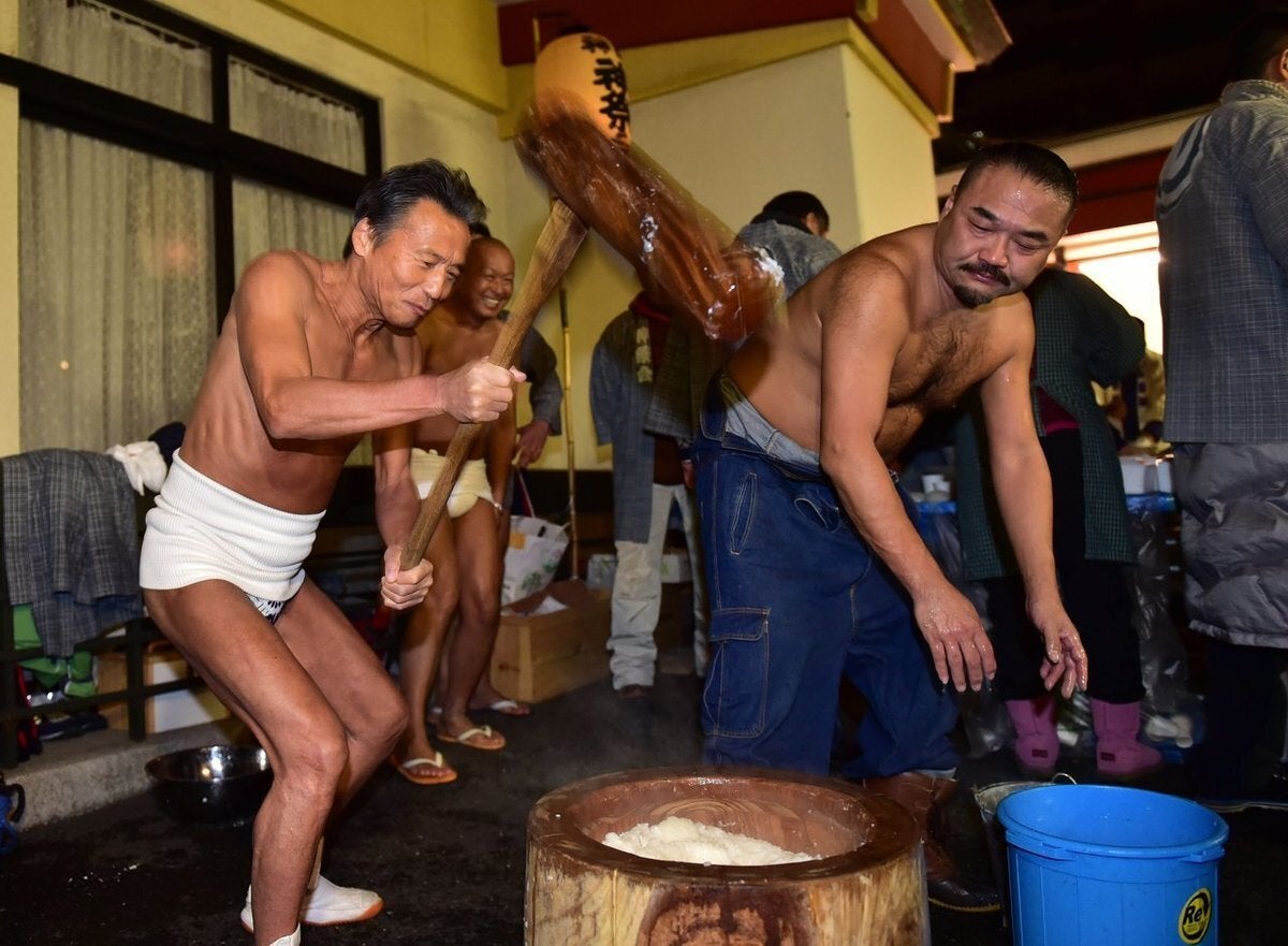 Άνδρες στην Ιαπωνία χτυπούν βρασμένο ρύζι για το φτιάξουν το παραδοσιακό κέικ ρυζιού (mochi).