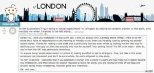 Κάτι τέτοιο συνέβη στη χρήστη του Reddit, qiba, τις προάλλες στο Λονδίνο. Μόνο που η συγκεκριμένη κοπέλα περνούσε μια αρκετά δύσκολη μέρα και δεν είχε καμία όρεξη να γίνει μέρος ενός κοινωνικού πειράματος. Το αποτέλεσμα, ήταν να γράψει μια ανοιχτή επιστολή προς τον «Αυστραλό τύπο που έκανε ένα “κοινωνικό πείραμα” στην περιοχή του Islington, μιλώντας σε τυχαίες γυναίκες στο πάρκο και ο οποίος με προσέβαλλε όταν του ζήτησε να με αφήσει ήσυχη» -όπως έγραψε η ίδια.