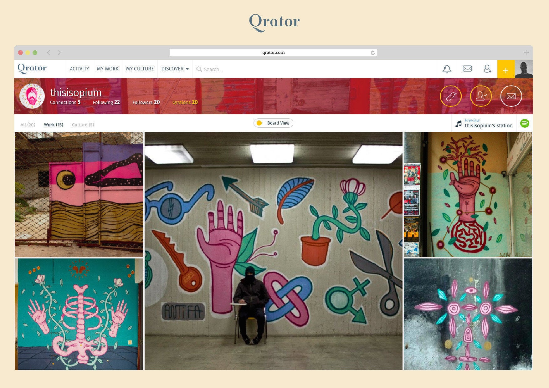 Η διαδικασία δημιουργίας ενός προφίλ δεν διαρκεί περισσότερα από 2-3 λεπτά και αφορά σε κινήσεις που έχουμε συνηθίσει και σε άλλα κοινωνικά δίκτυα (π.χ. ανέβασμα φωτογραφίας προφίλ, cover photo, κλπ). Οι ομοιότητες όμως με τα υπόλοιπα κοινωνικά ή επαγγελματικά δίκτυα σταματούν εκεί, αφού αποκλειστικά στο Qrator, οι δημιουργοί μπορούν να δημοσιεύουν και την «κουλτούρα» τους, εκτός από τη δουλειά τους. Με αυτόν τον τρόπο, η κοινότητα μπορεί να σχηματίζει μία πλήρη εικόνα για το brand DNA τους. Άλλωστε, όπως έχει δηλώσει και ο διάσημος marketeer Simon Sinek, «People don’t buy what you do; they buy why you do it».