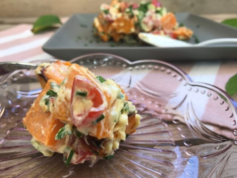 Επειδή η γλυκοπατάτα όταν βράζει έχει την ιδιότητα να λιώνει και να μην «κρατάει» όπως η πατάτα, προτίμησα να την βάλω πρώτα στον φούρνο και μετά να την κάνω σαλάτα.