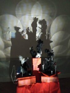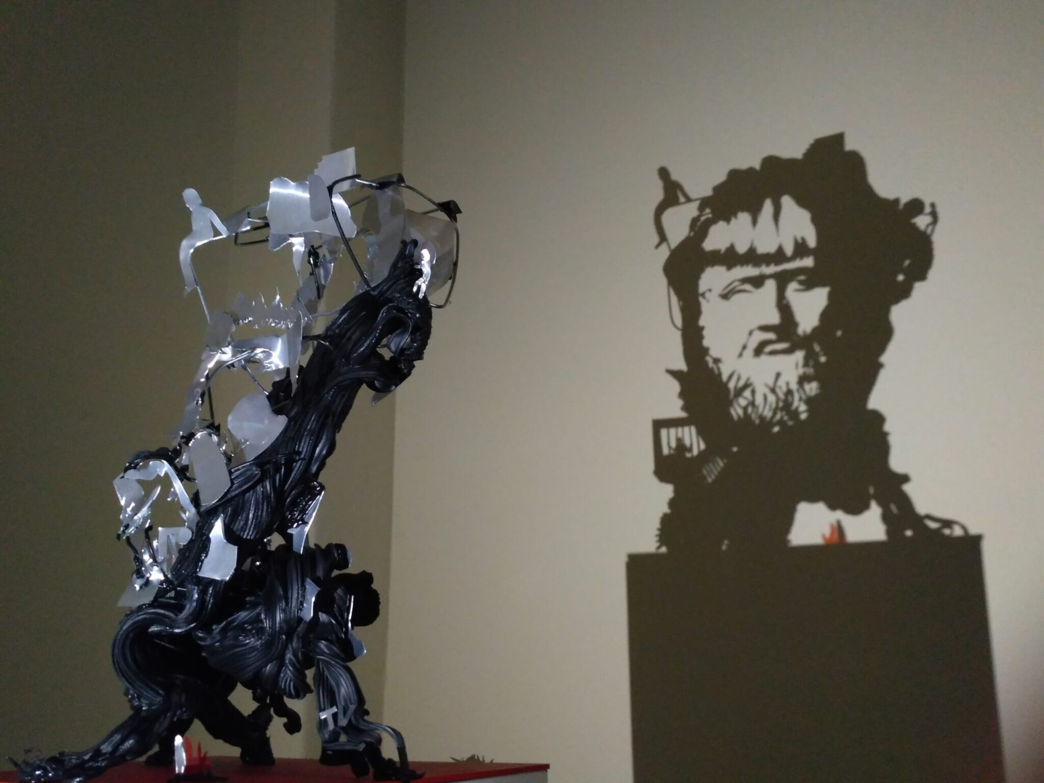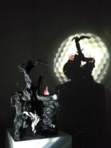 Το τρίτο έργο είναι μία σύνθεση τριών γλυπτών. Το κεντρικό έργο είναι σταθερό και η σκιά του απεικονίζει τον άνθρωπο (ανθρωποκεντρικό)… Τα δύο ακριανά γλυπτά περιστρέφονται και οι σκιές τους αλλάζουν. Αλλάζουν όμως, κατά τέτοιο τρόπο, ώστε να δημιουργούν ένα σενάριο. Το δεξί μέρος της σκιάς είναι ο κόσμος των ιδεών, ενώ το αριστερό ο κόσμος των αισθήσεων, της ύλης και των σαρκικών επιθυμιών. Στον κόσμο των ιδεών, ό,τι υπάρχει σε ανθρώπινη φιγούρα δεν είναι άνθρωπος, αλλά μια ιδέα. Η περιστροφή του γλυπτού δημιουργεί εναλλασσόμενες σκιές που σε συνδυασμό με τη σταθερή σκιά του ακίνητου έργου μας δείχνουν, σαν σε κινούμενα σχέδια, την κύηση, τη γέννηση, την ωρίμανση και την εναλλαγή των ιδεών. Από την άλλη πλευρά, στον κόσμο των αισθήσεων μπορεί κανείς να εντοπίσει το σύνολο των αισθήσεων. Το έργο αυτό αποτελεί μια αναφορά στον αισθητό και το νοητό κόσμο, η οποία αναφορά «προβάλλεται» στη σκιά, αλλά εντοπίζεται, με ανατρεπτικό τρόπο, και στο ότι ο νοητός κόσμος έιναι το ίδιο το έργο (η ιδέα της δημιουργίας του και η προέκτασή του)…