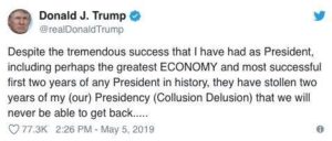 «Παρά την εκπληκτική επιτυχία που είχα ως πρόεδρος, συμπεριλαμβανομένης προφανώς της ΟΙΚΟΝΟΜΙΑΣ, αλλά και τα πιο επιτυχημένα δύο πρώτα χρόνια, που είχε ποτέ ένας πρόεδρος στην αμερικανική ιστορία, μου έκλεψαν δύο χρόνια από την προεδρία μου (μας) (Ψευδαίσθηση Συνωμοσίας) τα οποία δεν θα μας επιστραφούν ποτέ».